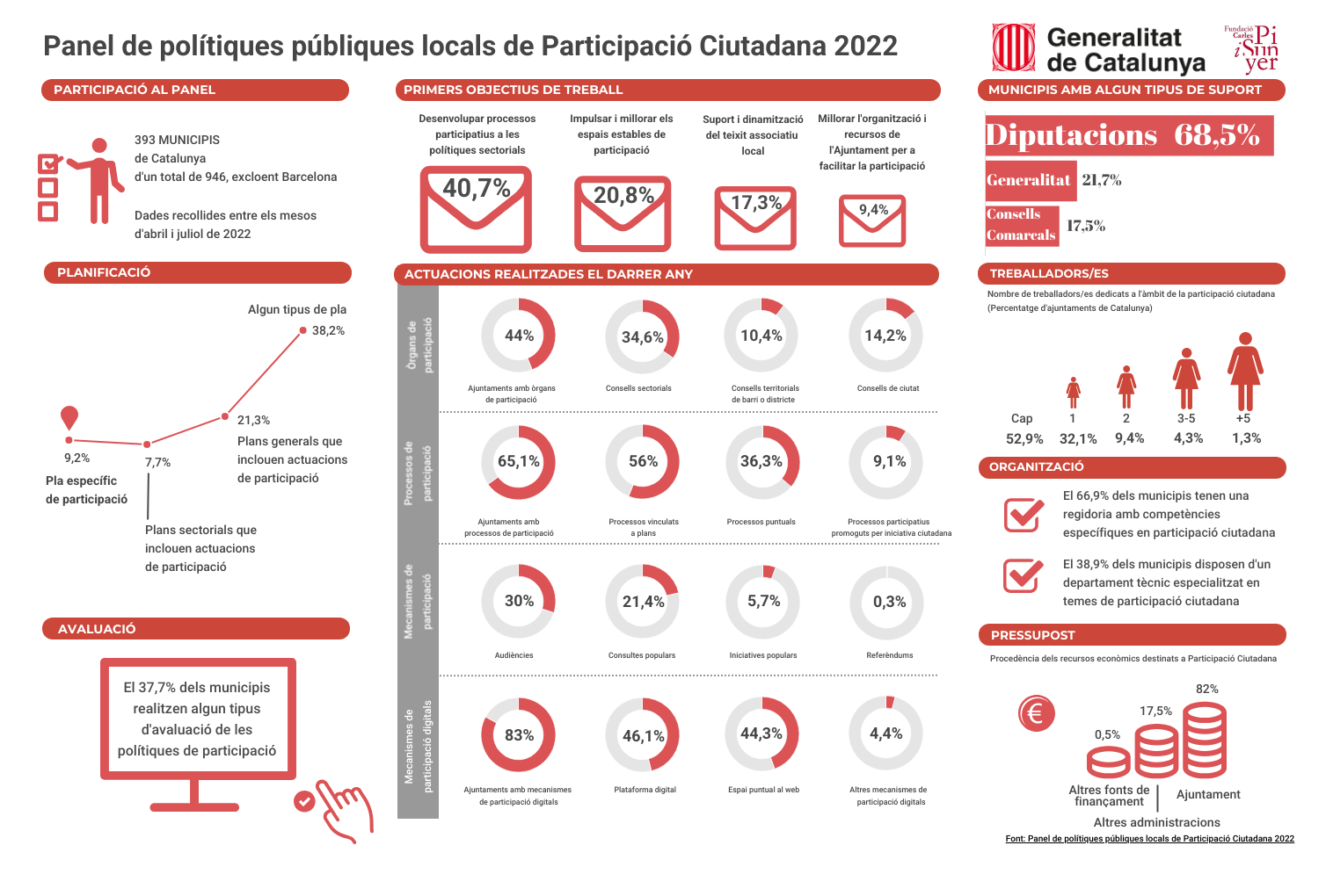 Este estudio corresponde a la octava edición del Panel de Políticas públicas Locales de Participación Ciudadana, iniciado en 2008. Es una iniciativa de la Fundació Carles Pi i Sunyer con la colaboración de la Direcció General de Participació Ciutadana i Processos Electorals del Departament d'Acció Exterior, Relacions Institucionals i Transparència. Generalitat de Catalunya, que tiene como objetivo recoger de forma periódica y sistemática aquella información relevante y de utilidad para el análisis, la evaluación y la mejora de las políticas locales. Los municipios participantes reciben un informe particularizado que les permite hacer un seguimiento de sus políticas y comparar estos datos con los de otros municipios. Otro producto del Panel es un estudio elaborado por un especialista, que se publica en la web, que analiza el estado de la situación, las tendencias y los desafíos de las políticas de participación ciudadana.